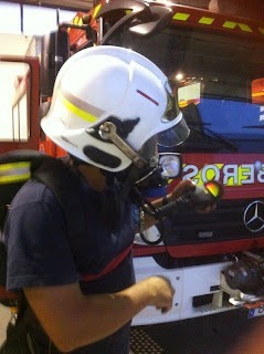 “Cuando vamos a una intervención, los bomberos se van vistiendo, se ponen el equipo de intervención, cada uno tiene su máscara ya preparada, esto se engancha al casco. Abres la botella y la botella nos da para trabajar aproximadamente unos 40 minutos. Esto lleva una especie de ordenador, nos dice el consumo de aire, el tiempo que nos queda y si nos quedamos parados empieza a pitar. Por si algún bombero se desmaya o se le cae algo en la cabeza o le deja inconsciente. Se llama la alarma de hombre muerto”, una técnica beneficiosa que nos explica uno de los bomberos. Además, llevan una conexión en Y, porque hay veces que cuando entran en un incendio y hay alguna persona afectada por el humo, utilizan una especie de capucha que le da aire fresco para que la víctima pueda respirar. Esta función es propia del bombero número 3 que junto con el 4 se dedican a las tareas de rescate. Mientras que el bombero número 1 y número 2 se encargan de la extinción. El bombero conductor no entra en el fuego, se queda en la bomba. El camión tiene una toma de fuerzas, se conectan y atrás hay una bomba que es la que impulsa el agua del camión. Se conectan las mangueras y la función del bombero conductor es poner la manguera desde el camión hasta el portal (en el caso del incendio de una vivienda).